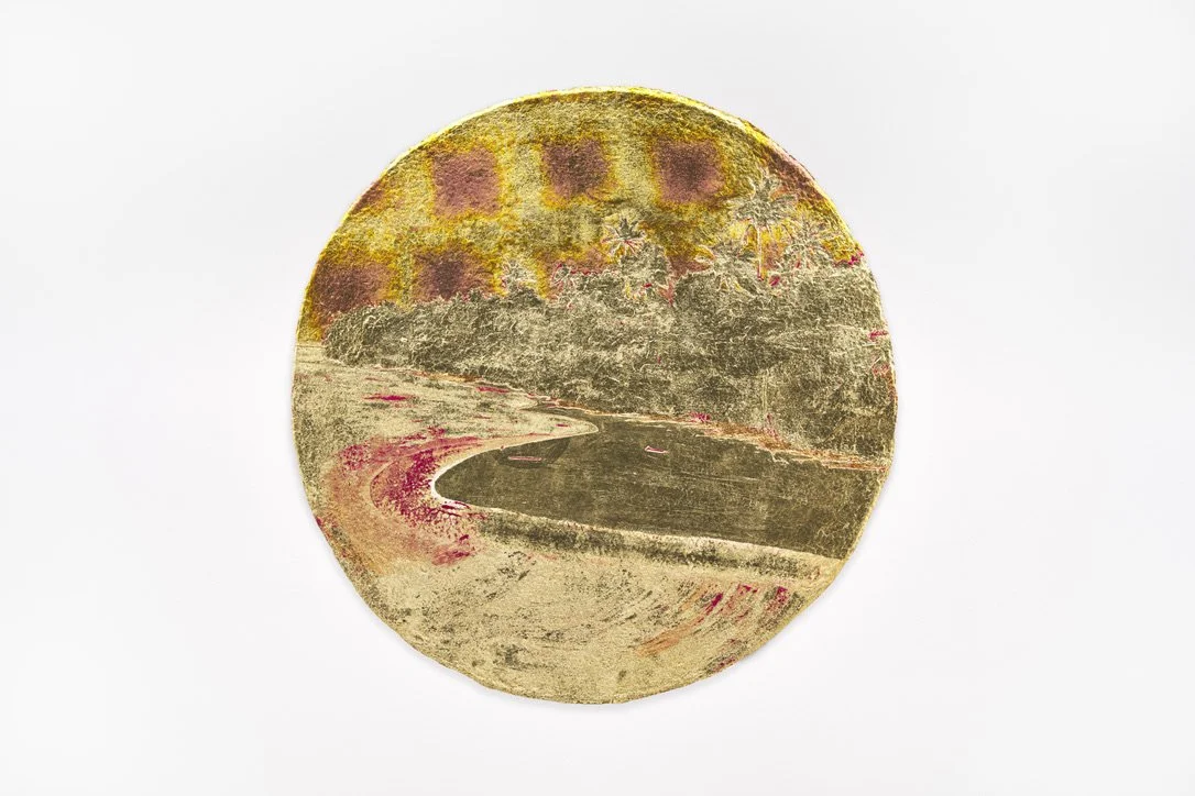 Whether working on paper or on canvas, Waddell uses wide array of processes to create lush texture, including gilding, embossing, and other unexpected approaches. The result is a temporal experience that requires movement and time to fully see her subject matter. She is candid about the seductive effect of reflective surfaces, further acknowledging that her use of gold, silver, and other precious metals alludes to entrenched, cultural notions of value and currency.